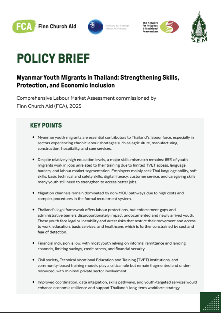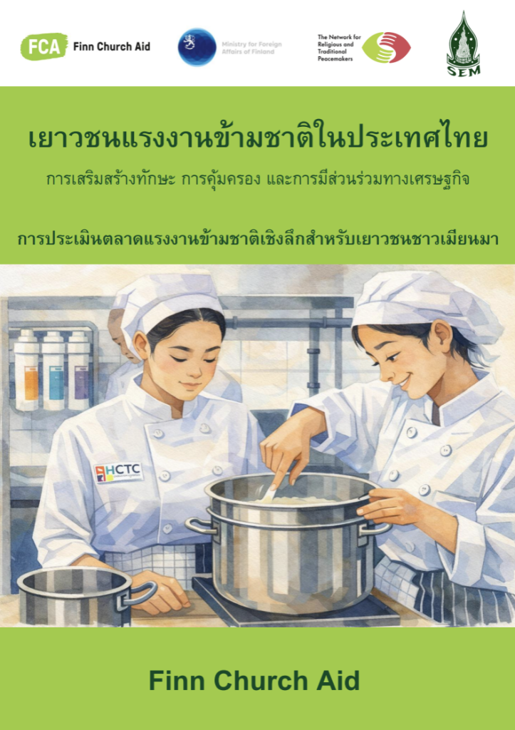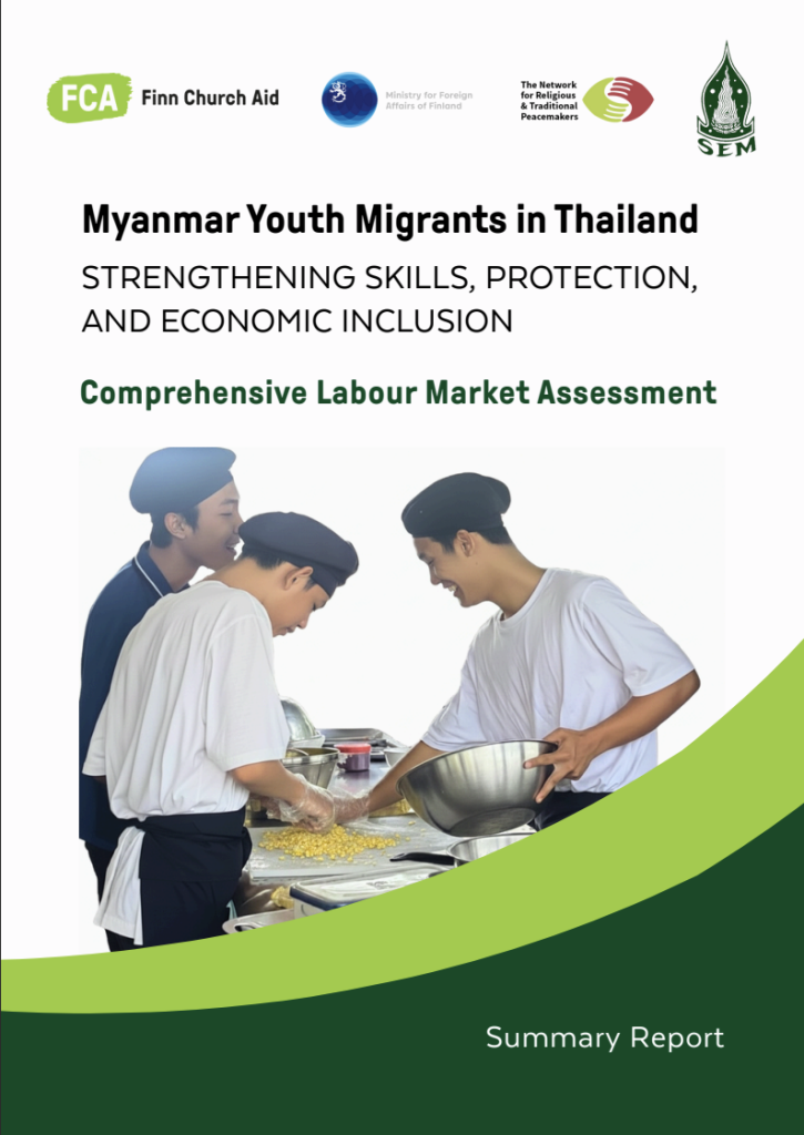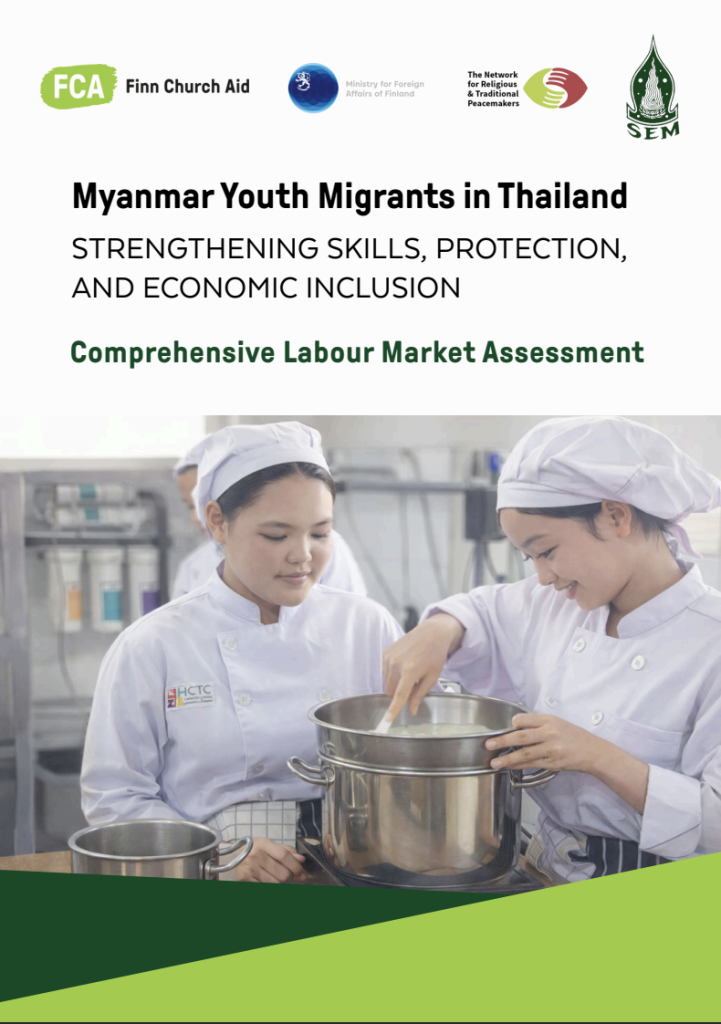 การประเมินตลาดแรงงานฉบับนี้จัดทำขึ้นภายใต้โครงการ Youth on the Move: A Regional Approach to Resilience ขององค์กร Finn Church Aid (FCA) ซึ่งเป็นความร่วมมือระหว่างสำนักงาน FCA ประจำประเทศเนปาล เมียนมา และประเทศไทย โดยได้รับการสนับสนุนจากกระทรวงการต่างประเทศฟินแลนด์ โครงการดังกล่าวบูรณาการยุทธศาสตร์ “สิทธิในการได้รับการศึกษาที่มีคุณภาพ” และ “สิทธิในการดำรงชีพที่มั่นคง” โดยเน้นการเสริมสร้างศักยภาพให้เยาวชนในสถานการณ์เปราะบางสามารถบรรลุความมั่นคงทางเศรษฐกิจด้วยตนเอง ควบคู่ไปกับการบูรณาการ “สิทธิในสันติภาพ” ผ่านการสร้างสภาพแวดล้อมและพื้นที่สนทนาที่ส่งเสริมภาวะผู้นำของเยาวชน การช่วยเหลือในกลุ่มเยาวชน และความสมานฉันท์ในสังคม เพื่อตอบโจทย์ทั้งสาเหตุและผลกระทบของวิกฤตการย้ายถิ่นอย่างรอบด้าน ในประเทศไทยมูลนิธิเอฟซีเอ (FCA) ประเทศไทย ร่วมมือกับเสมสิกขาลัยในการดำเนินกิจกรรมเสริมสร้างศักยภาพเยาวชนชาวเมียนมาที่ได้รับผลกระทบจากการโยกย้ายถิ่นฐาน ผ่านการให้ความรู้ ทักษะ และสร้างเครือข่ายที่จำเป็นต่อการย้ายถิ่นอย่างปลอดภัย การปรับตัว ป้องการแสวงหาประโยชน์ และส่งเสริมความสมานฉันท์ในสังคม